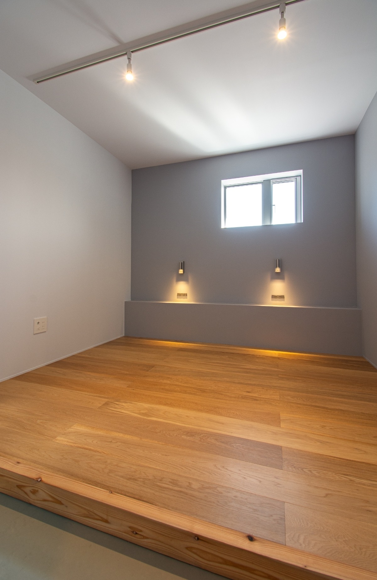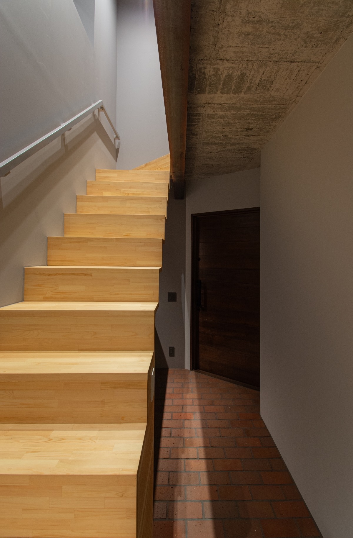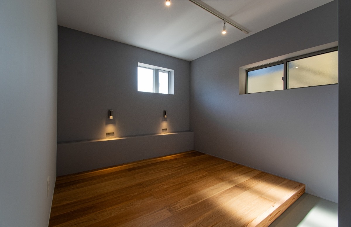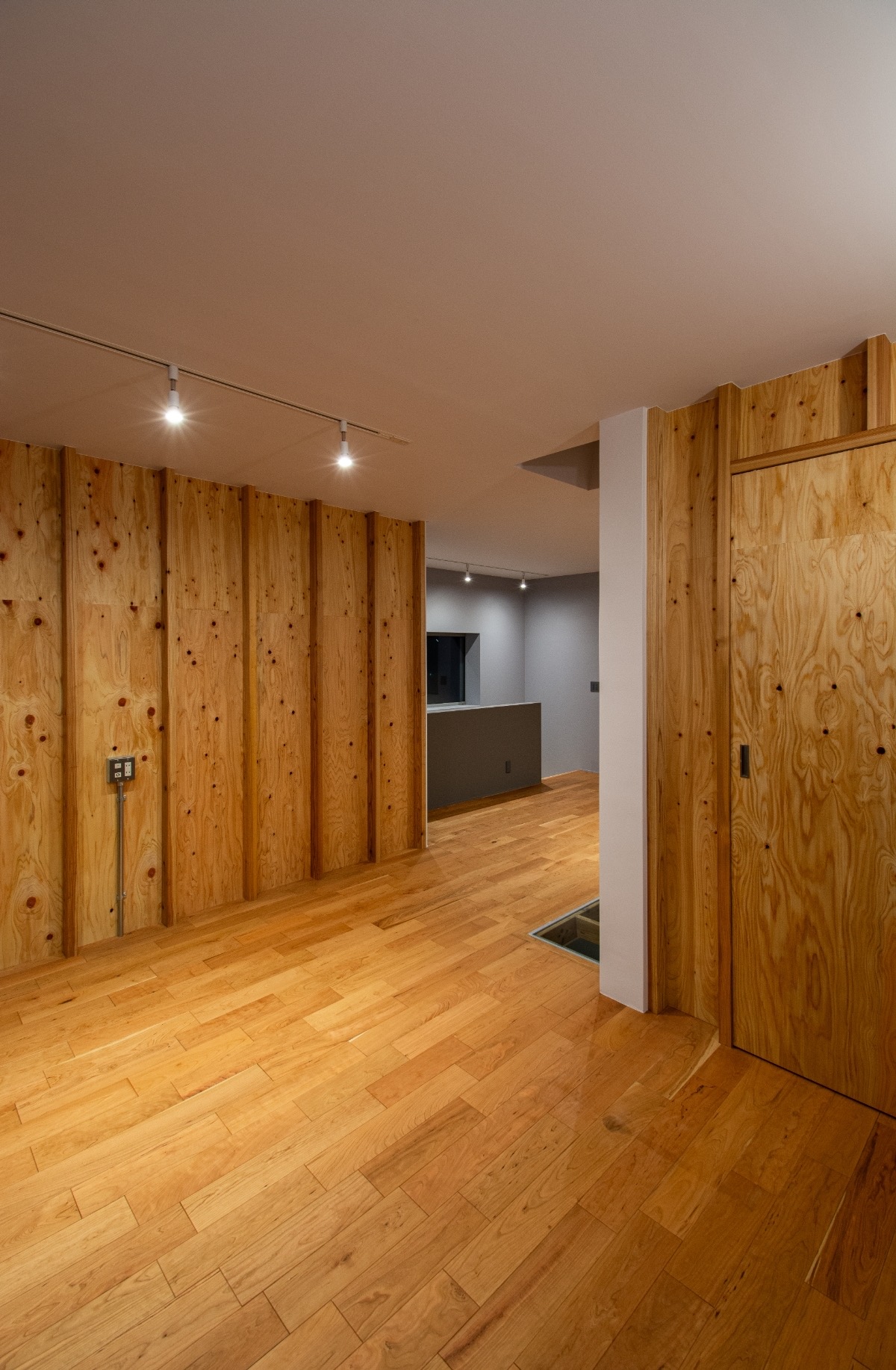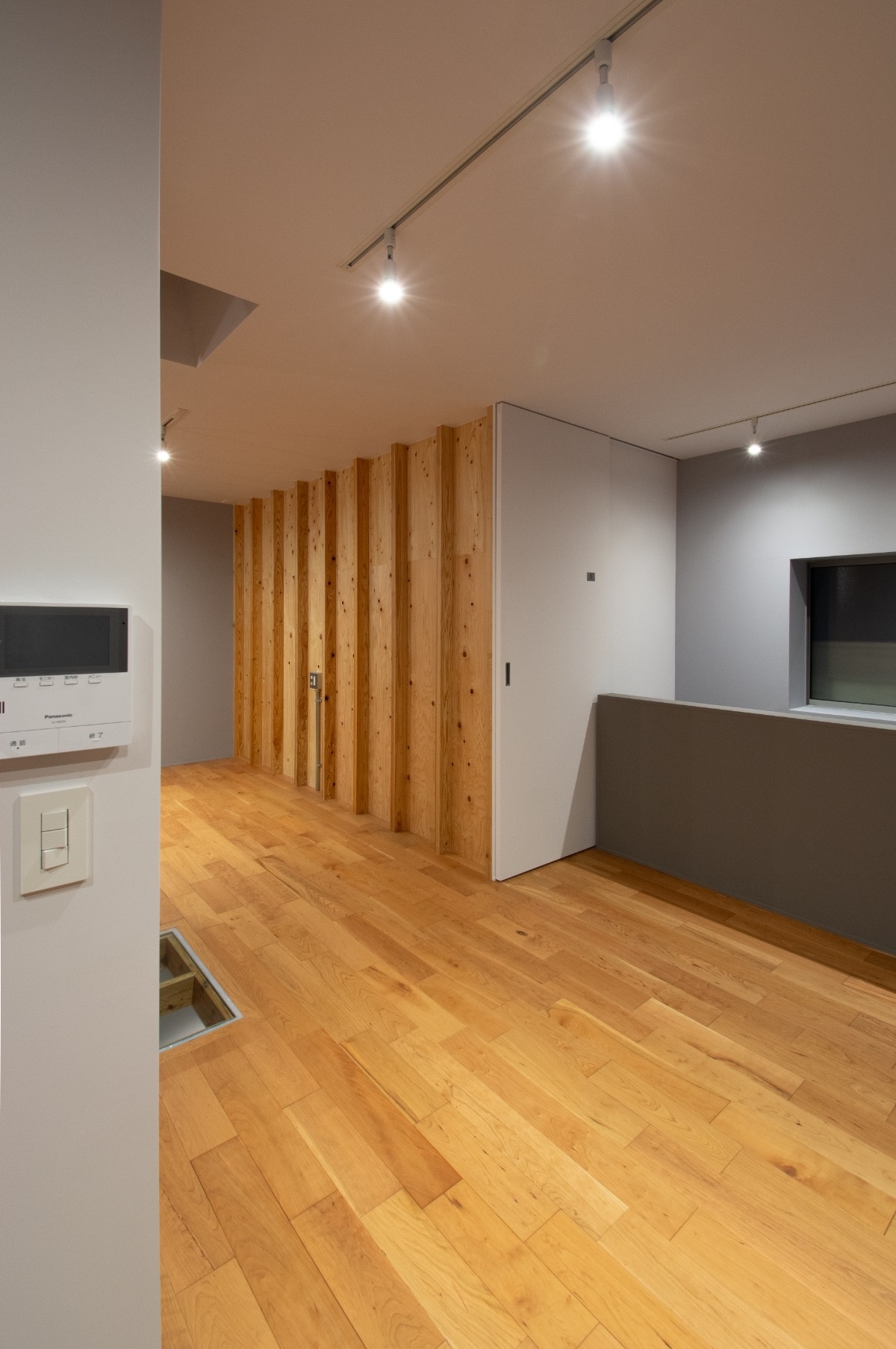 限られた敷地を最大限に活かし、機能性とデザイン性を両立させた都市型住宅です。グレーの壁面と木材、コンクリートといった異素材を組み合わせることで、シンプルな空間に奥行きを創出。トップライトや高窓から取り込む光が、時間とともに室内の表情を変化させ、空間の広がりを感じさせます。都会の喧騒から離れ、自分だけの静寂な時間を過ごせる、洗練された住まいです。