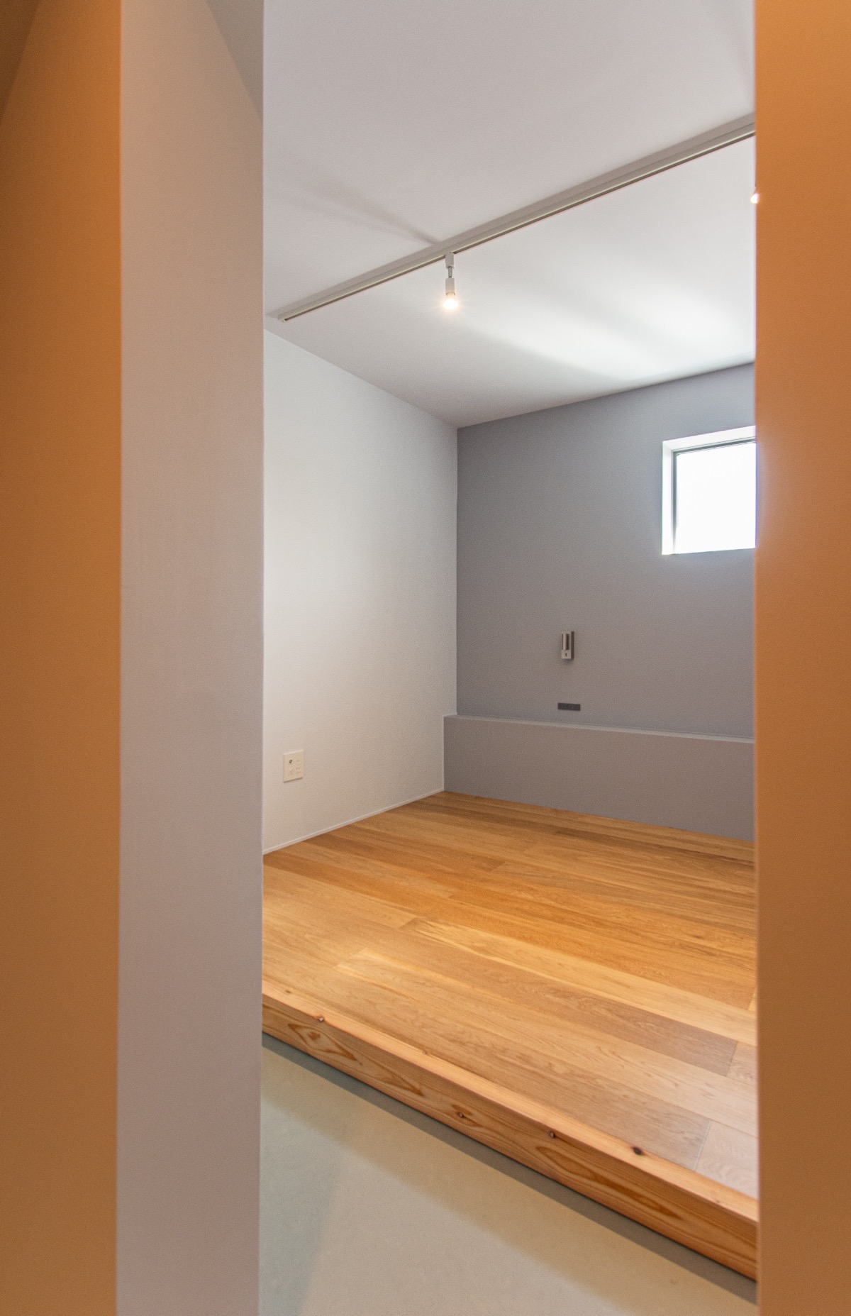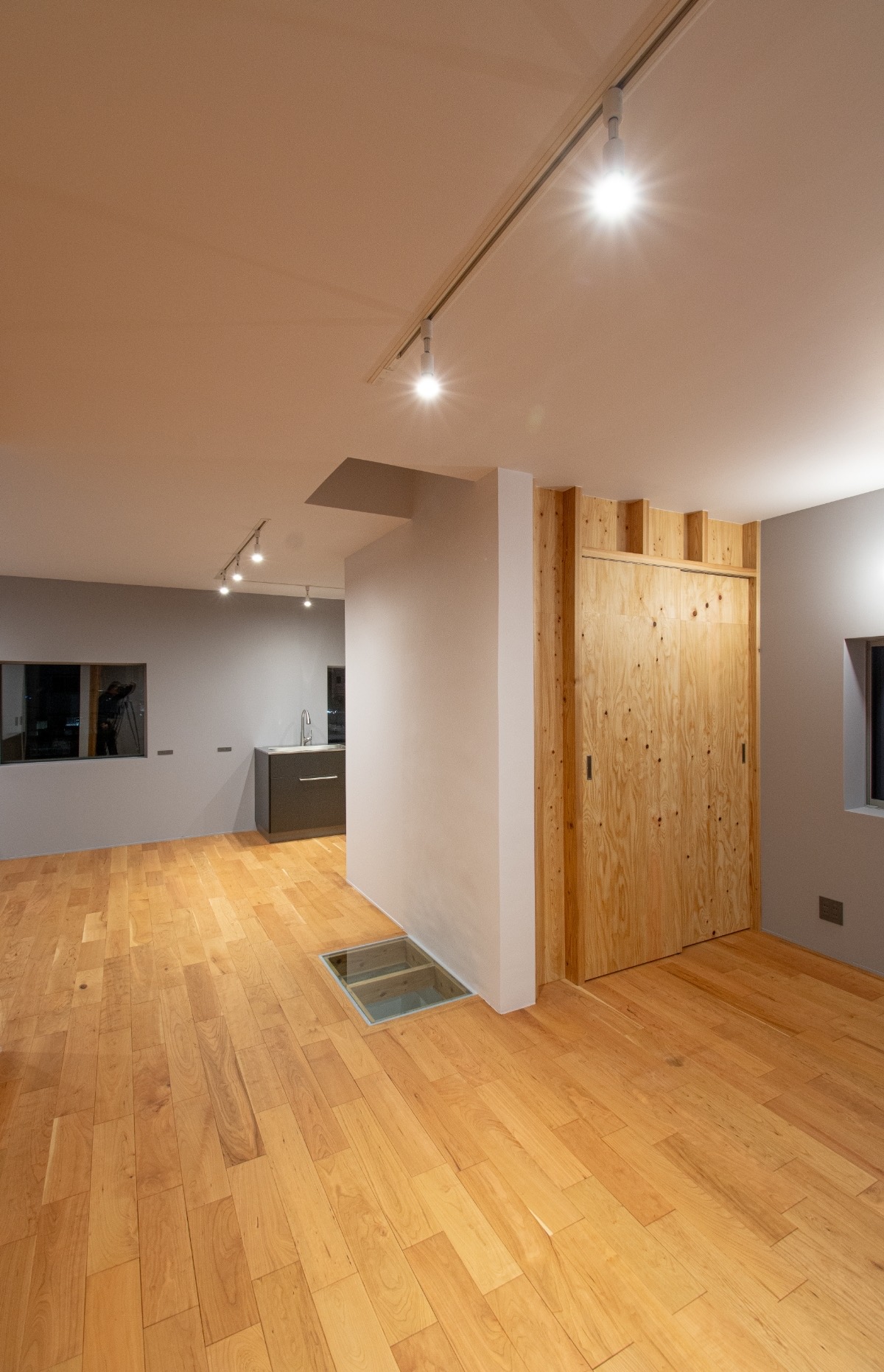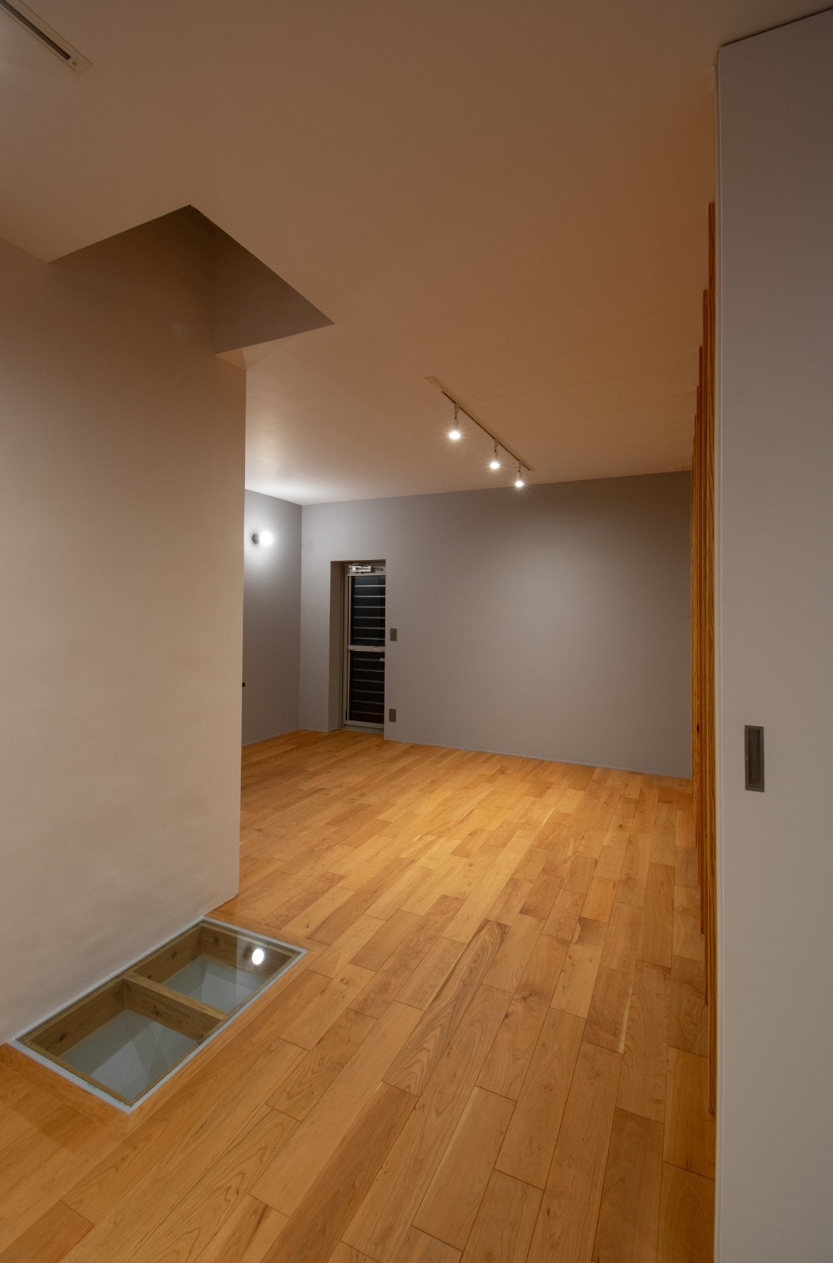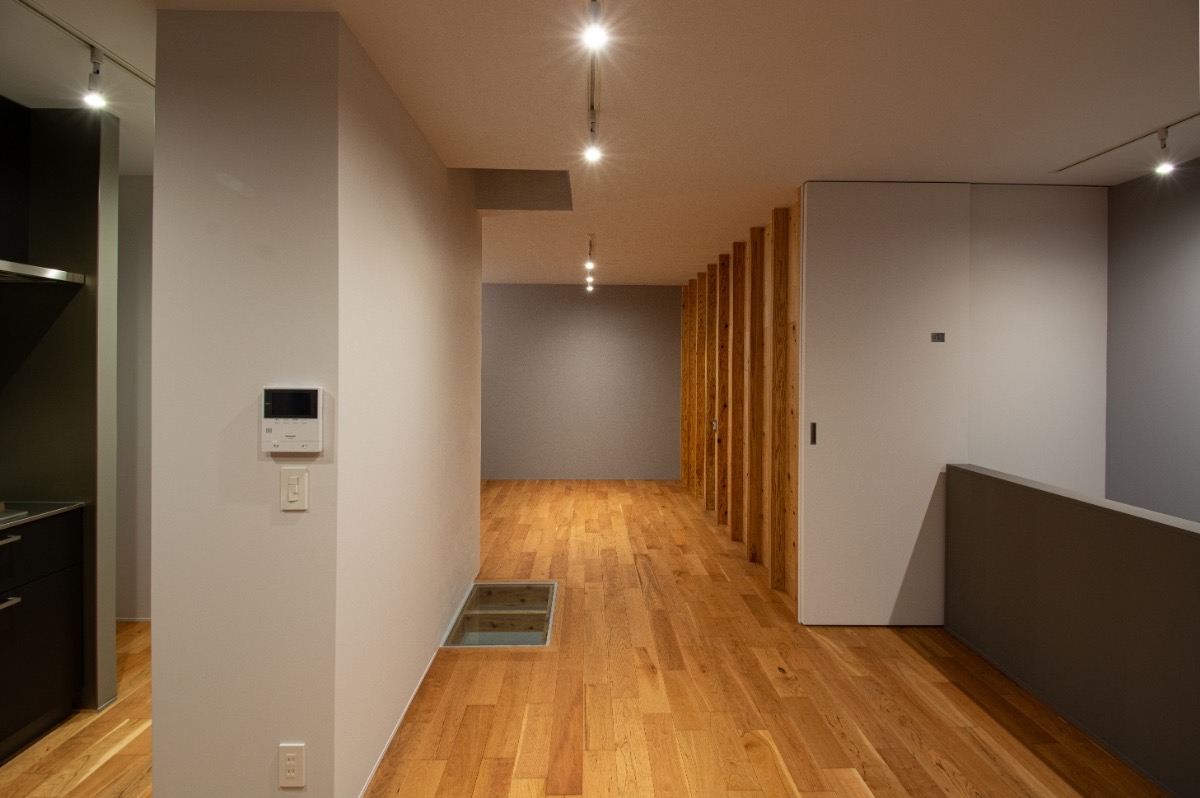 限られた敷地を最大限に活かし、機能性とデザイン性を両立させた都市型住宅です。グレーの壁面と木材、コンクリートといった異素材を組み合わせることで、シンプルな空間に奥行きを創出。トップライトや高窓から取り込む光が、時間とともに室内の表情を変化させ、空間の広がりを感じさせます。都会の喧騒から離れ、自分だけの静寂な時間を過ごせる、洗練された住まいです。