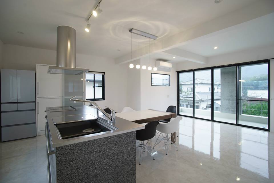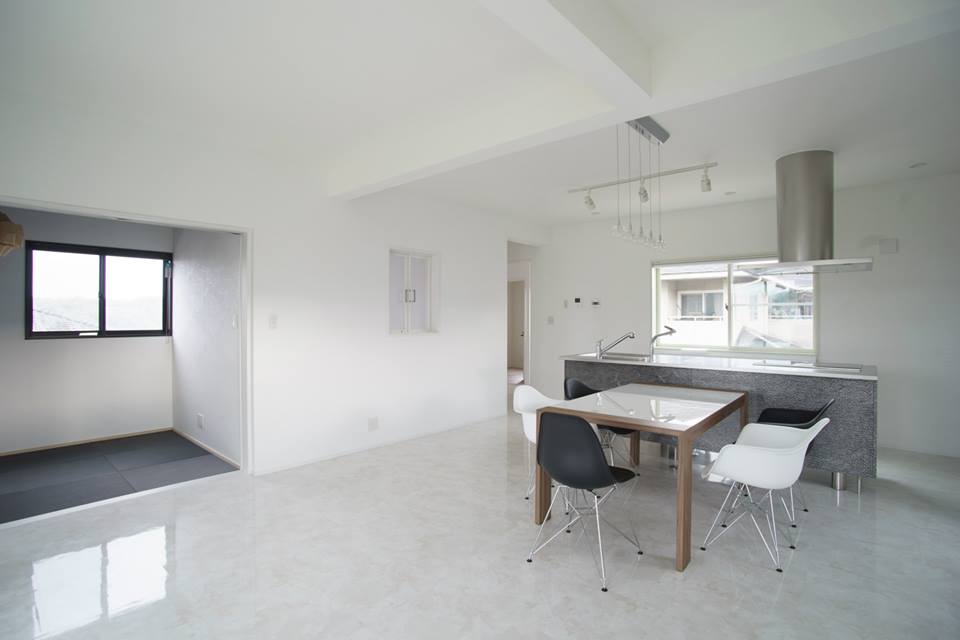 内装全体を白で統一することで、清潔感と広々とした開放感を追求しました。ステンレスのキッチンアイランドや、アイアンの手すりなど、異なる素材のテクスチャをアクセントとして取り入れることで、シンプルながらも単調にならない洗練された空間を創り出しています。また、大きな窓から差し込む自然光が、空間全体に穏やかな光を満たし、住まう人に安らぎをもたらします。