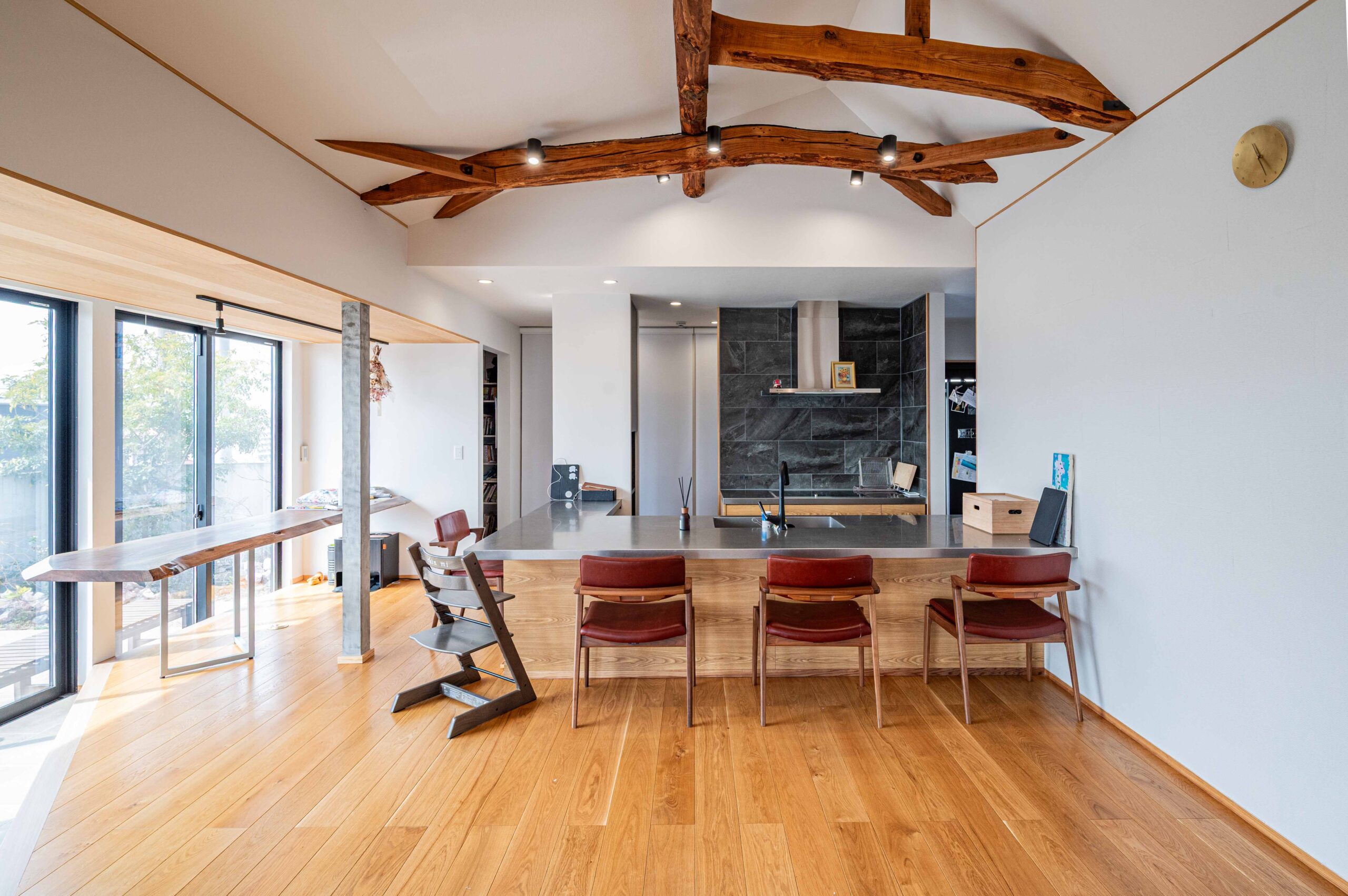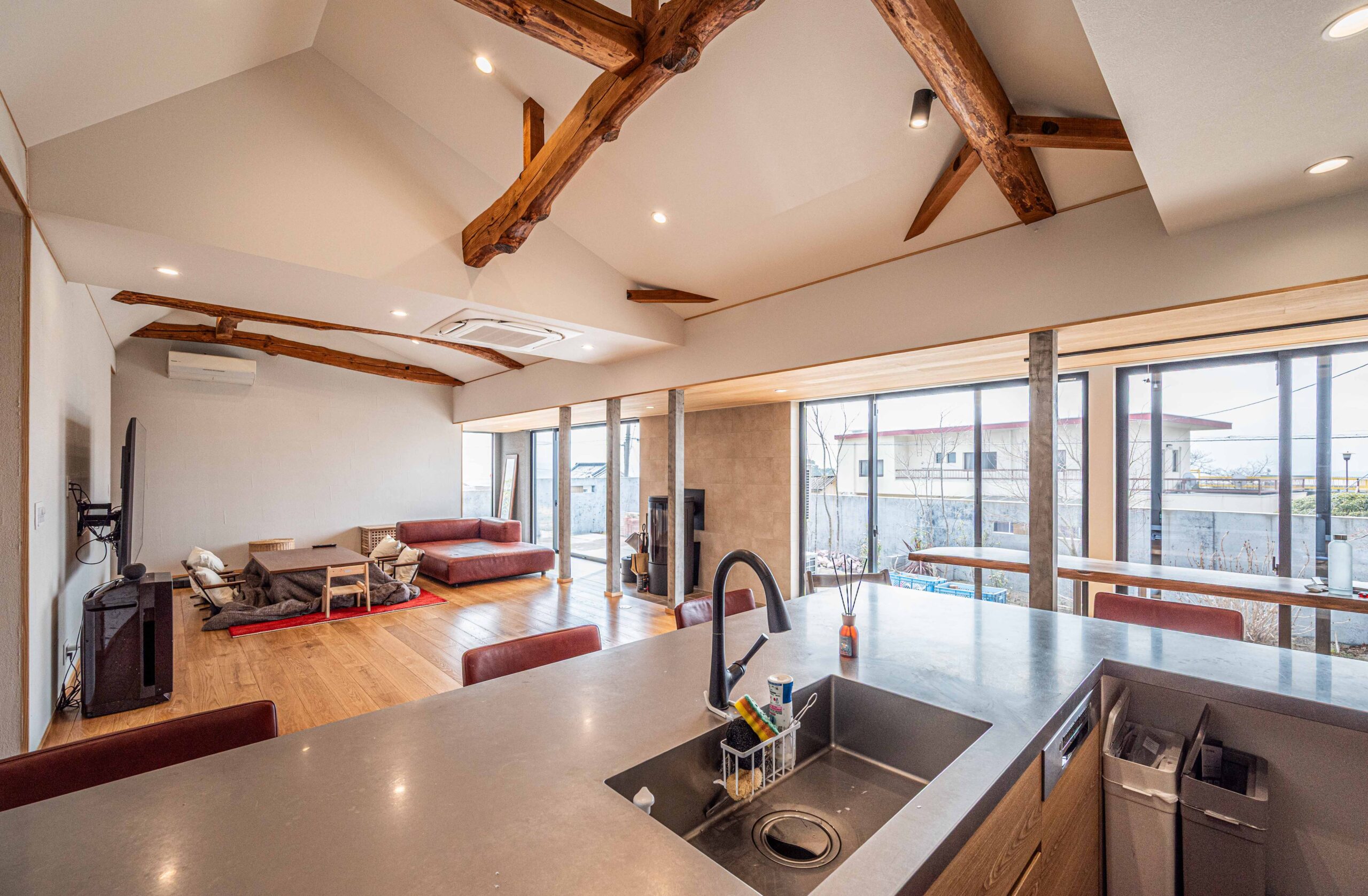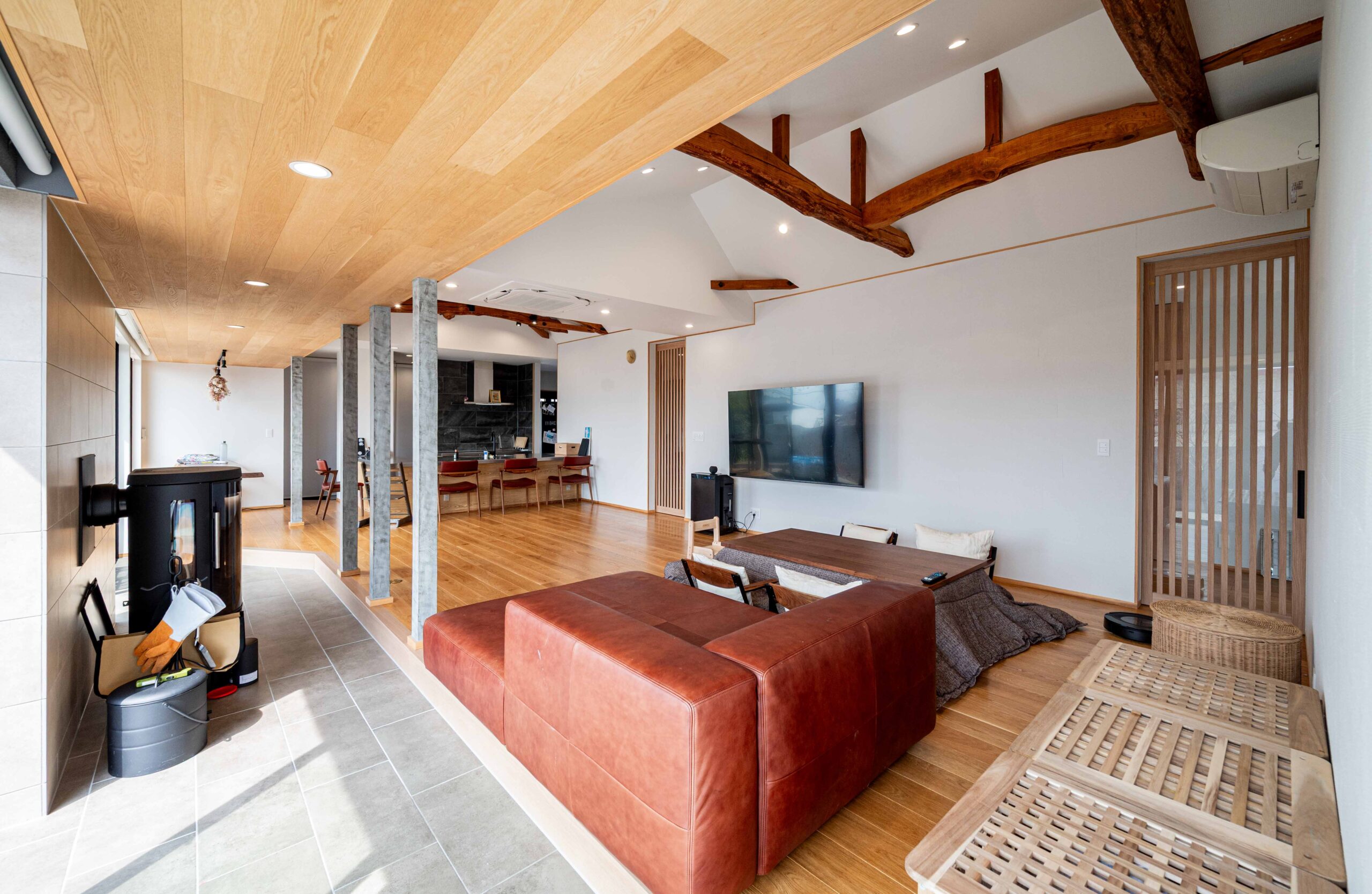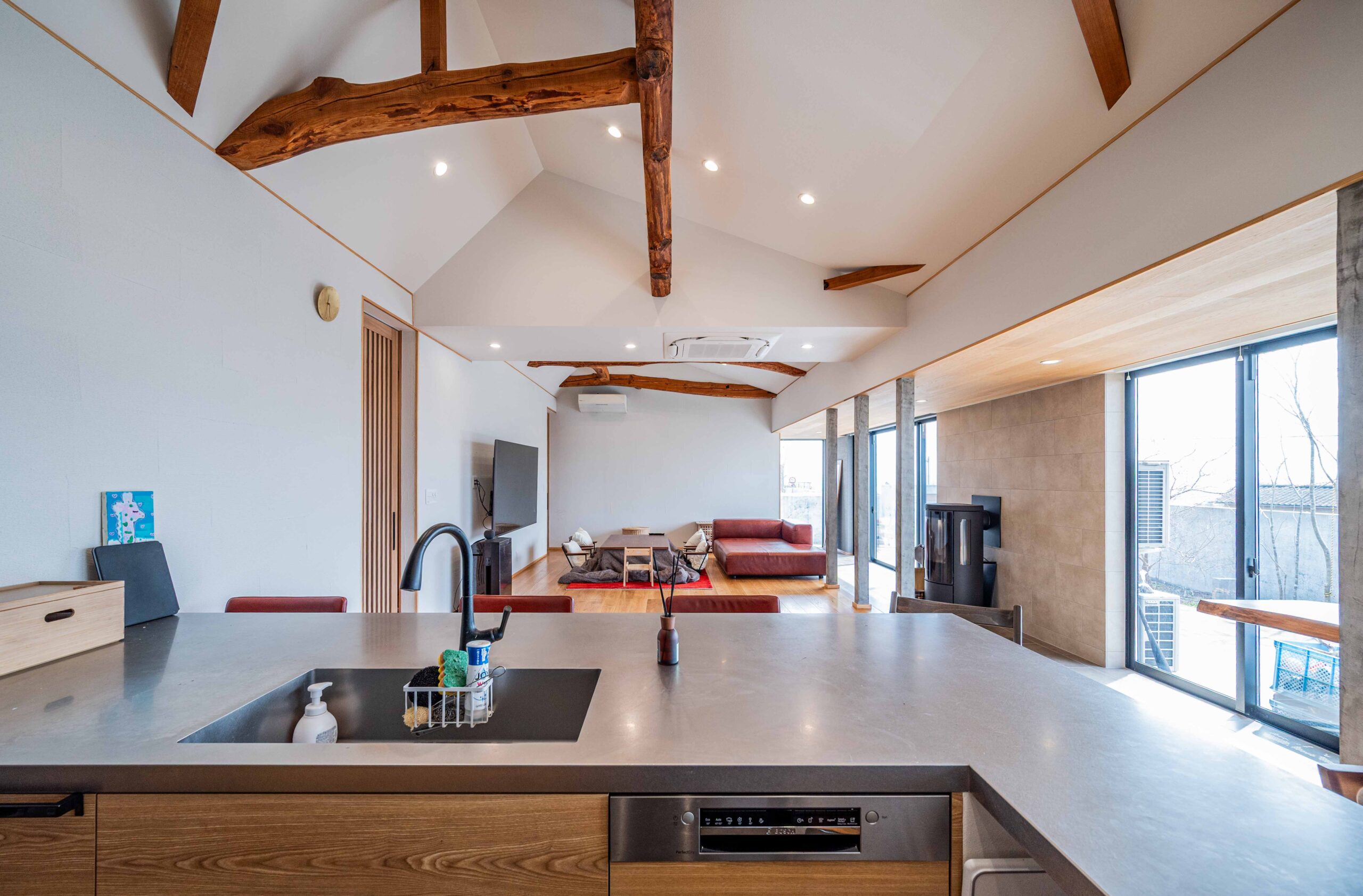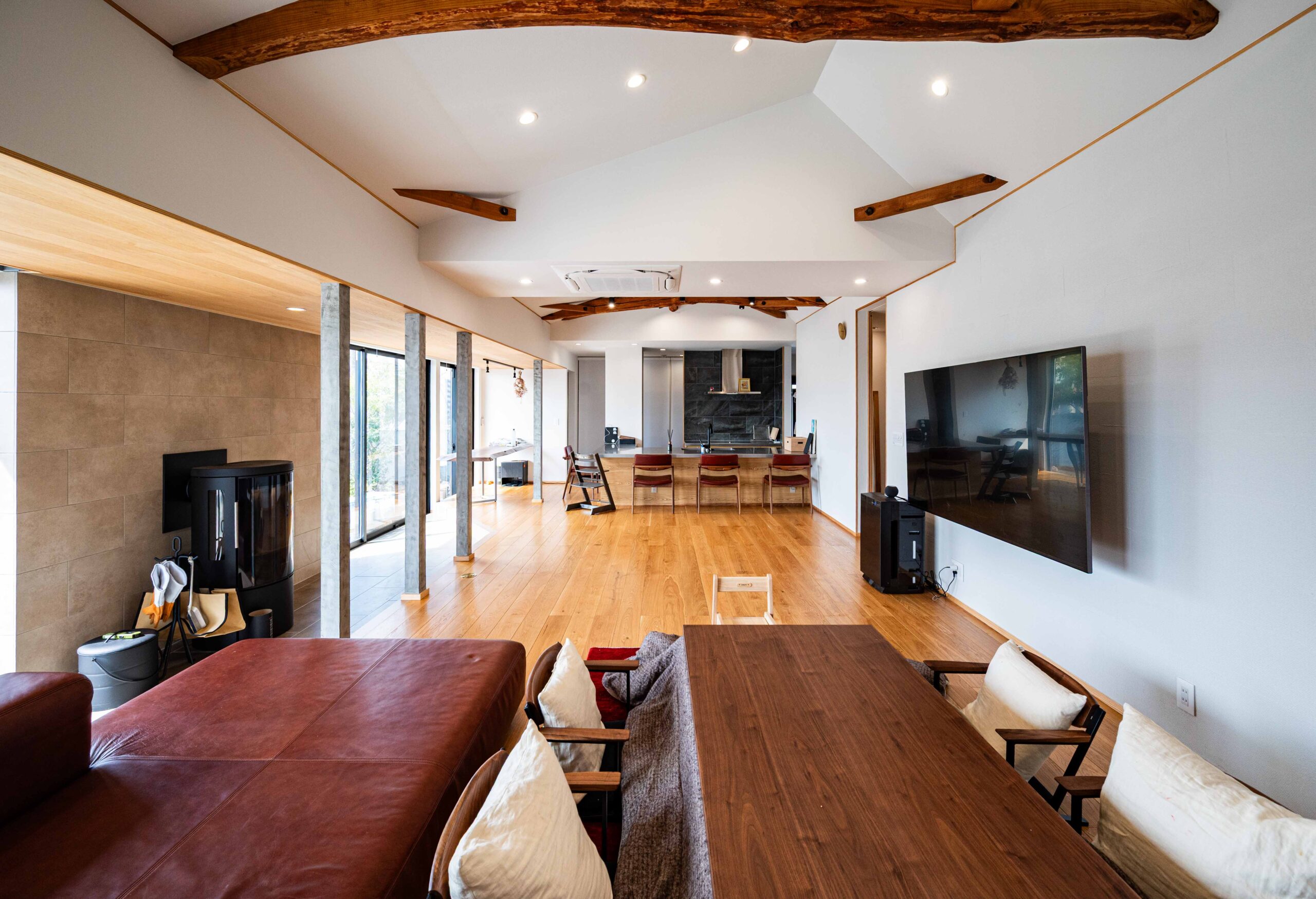 古民家から移築した古材の梁を活かし、歴史の温もりを感じさせる空間を創り出しました。一方で、現代的なシンプルさと機能性も兼ね備え、古材の魅力を最大限に引き立てています。薪ストーブやプライベートサウナといった特別な空間は、日々の暮らしに豊かさと安らぎをプラス。自然素材の心地よさと、住まう人の個性を大切にした住まいです。