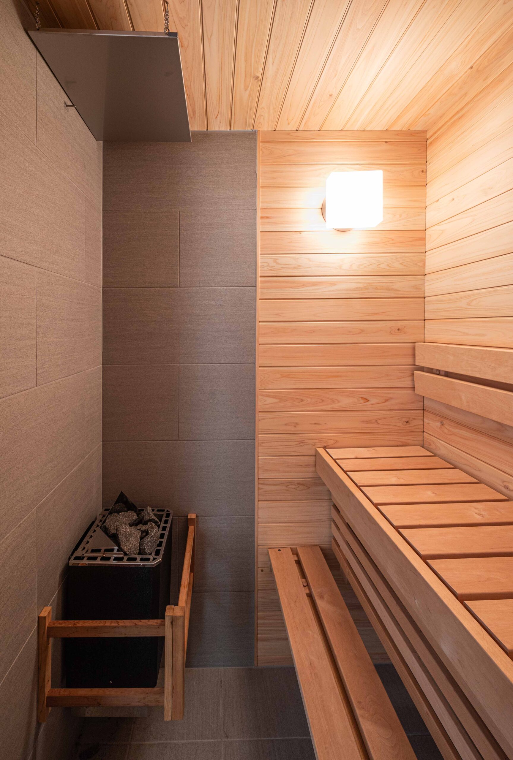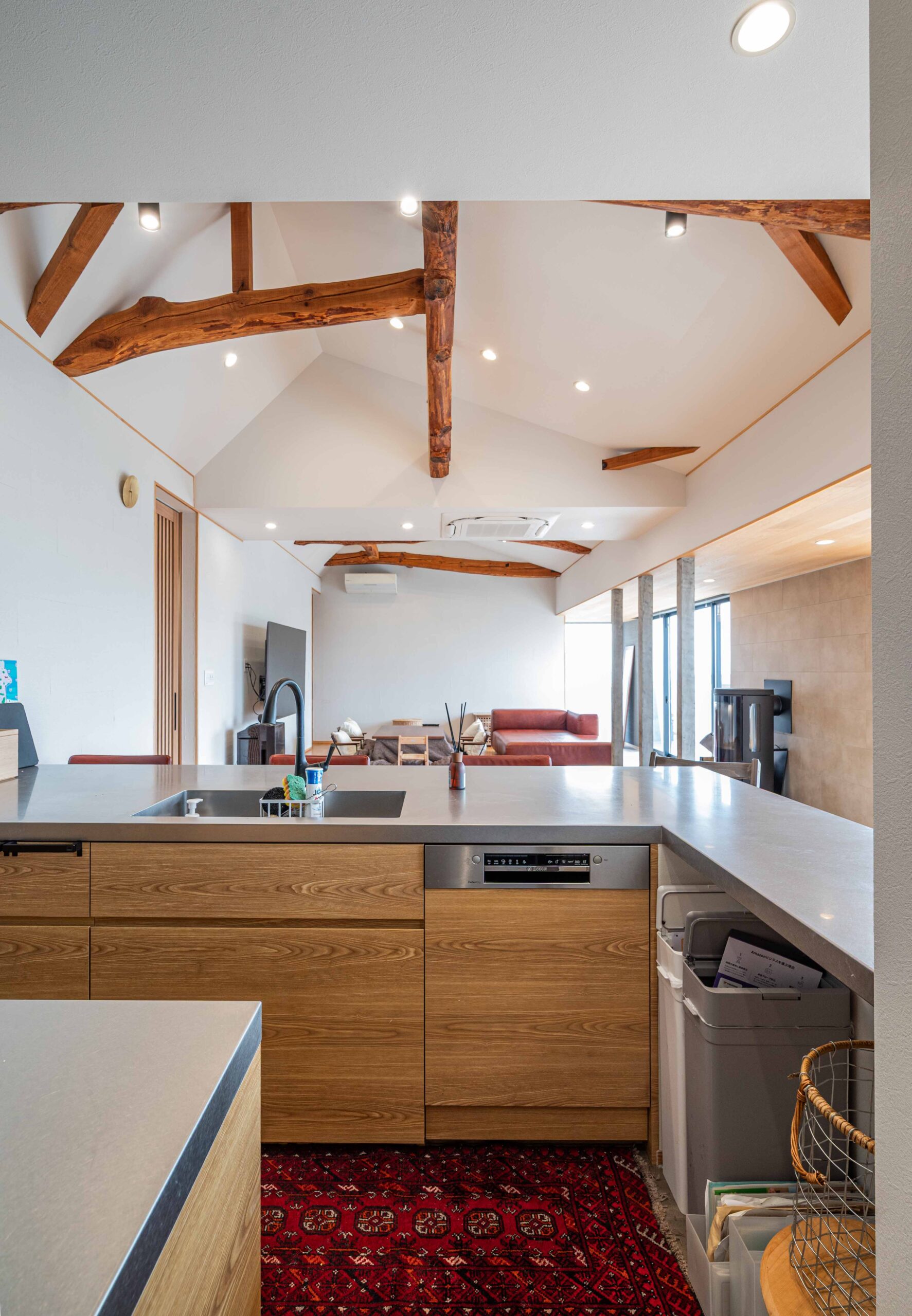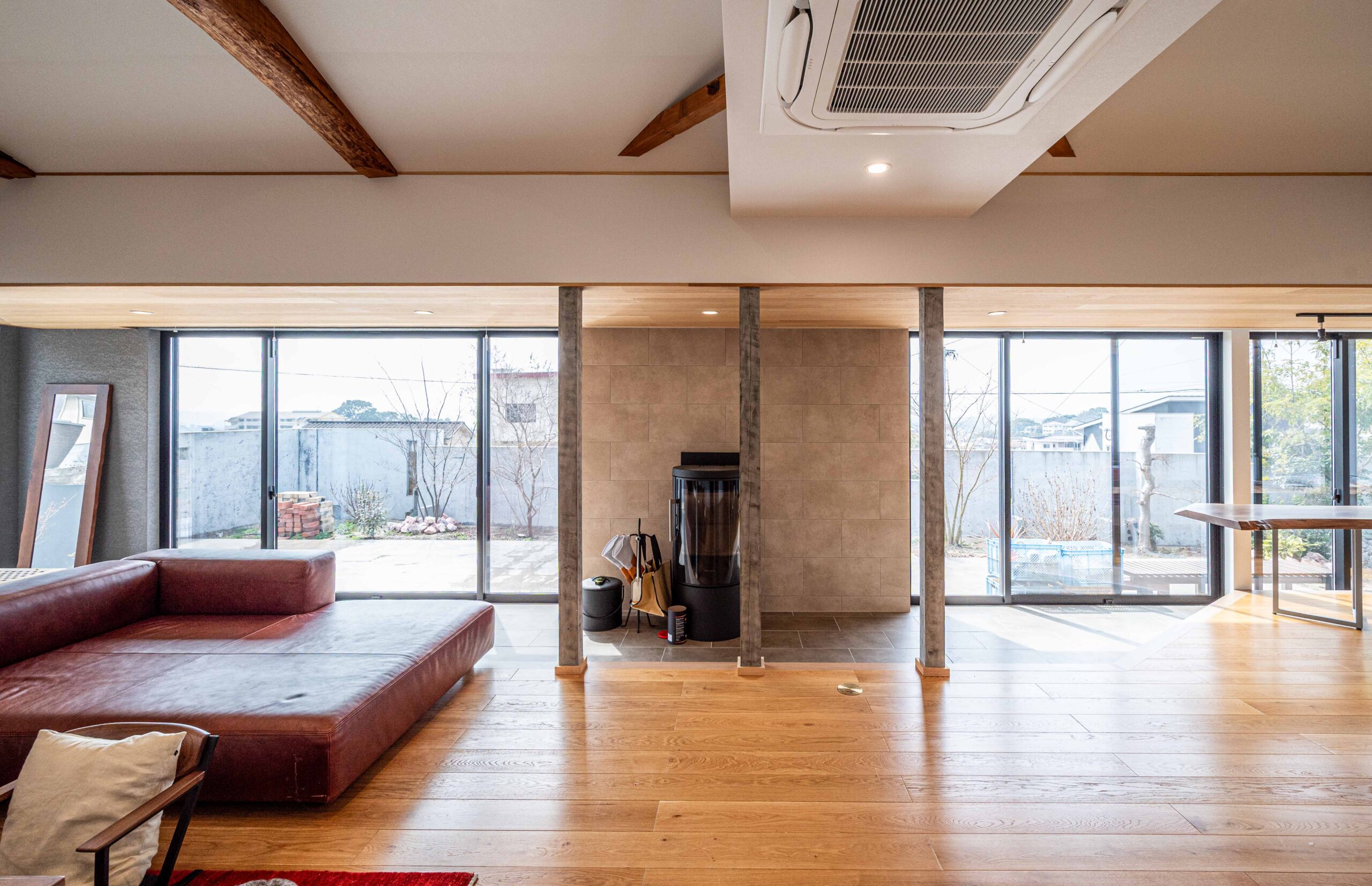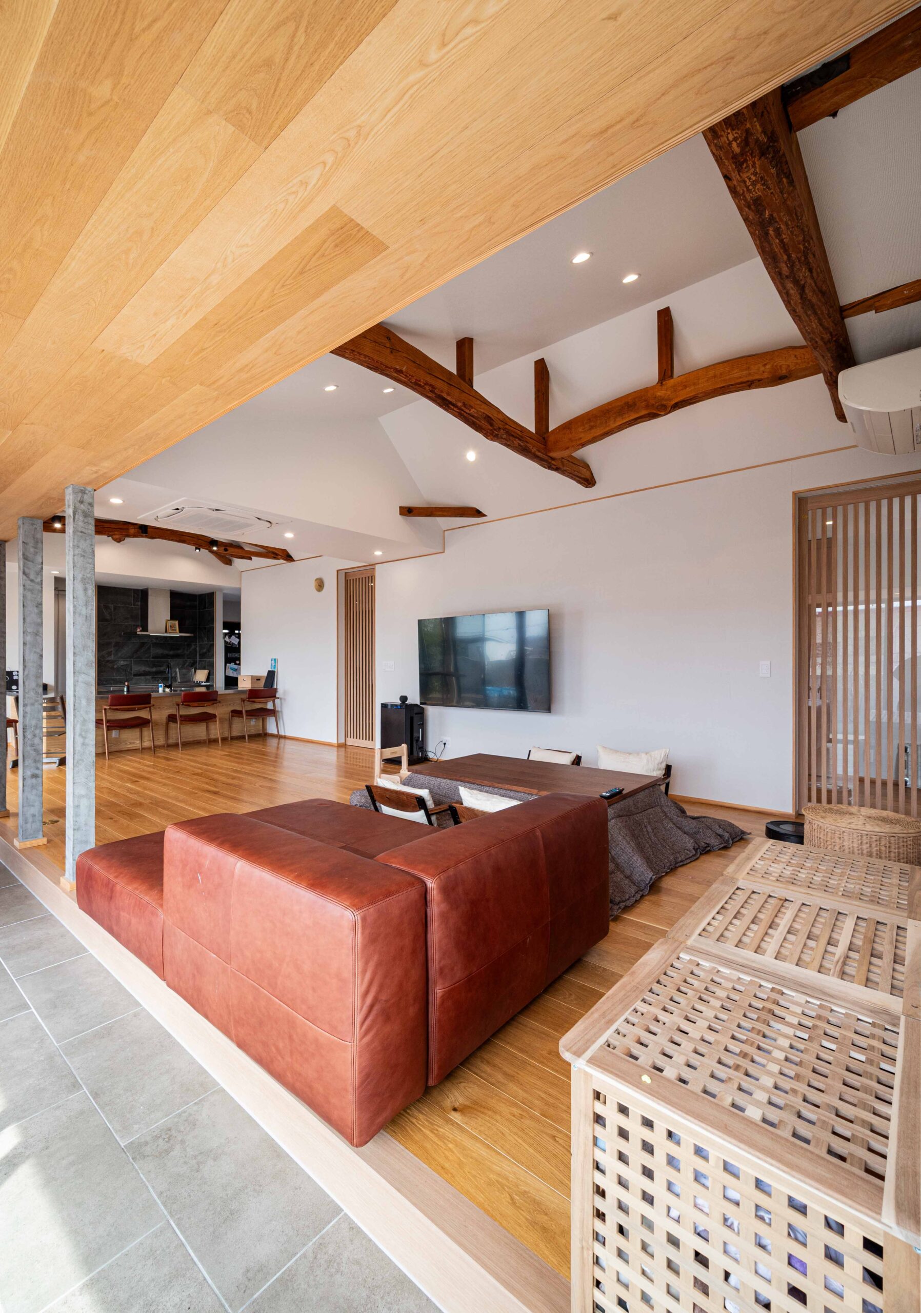 古民家から移築した古材の梁を活かし、歴史の温もりを感じさせる空間を創り出しました。一方で、現代的なシンプルさと機能性も兼ね備え、古材の魅力を最大限に引き立てています。薪ストーブやプライベートサウナといった特別な空間は、日々の暮らしに豊かさと安らぎをプラス。自然素材の心地よさと、住まう人の個性を大切にした住まいです。