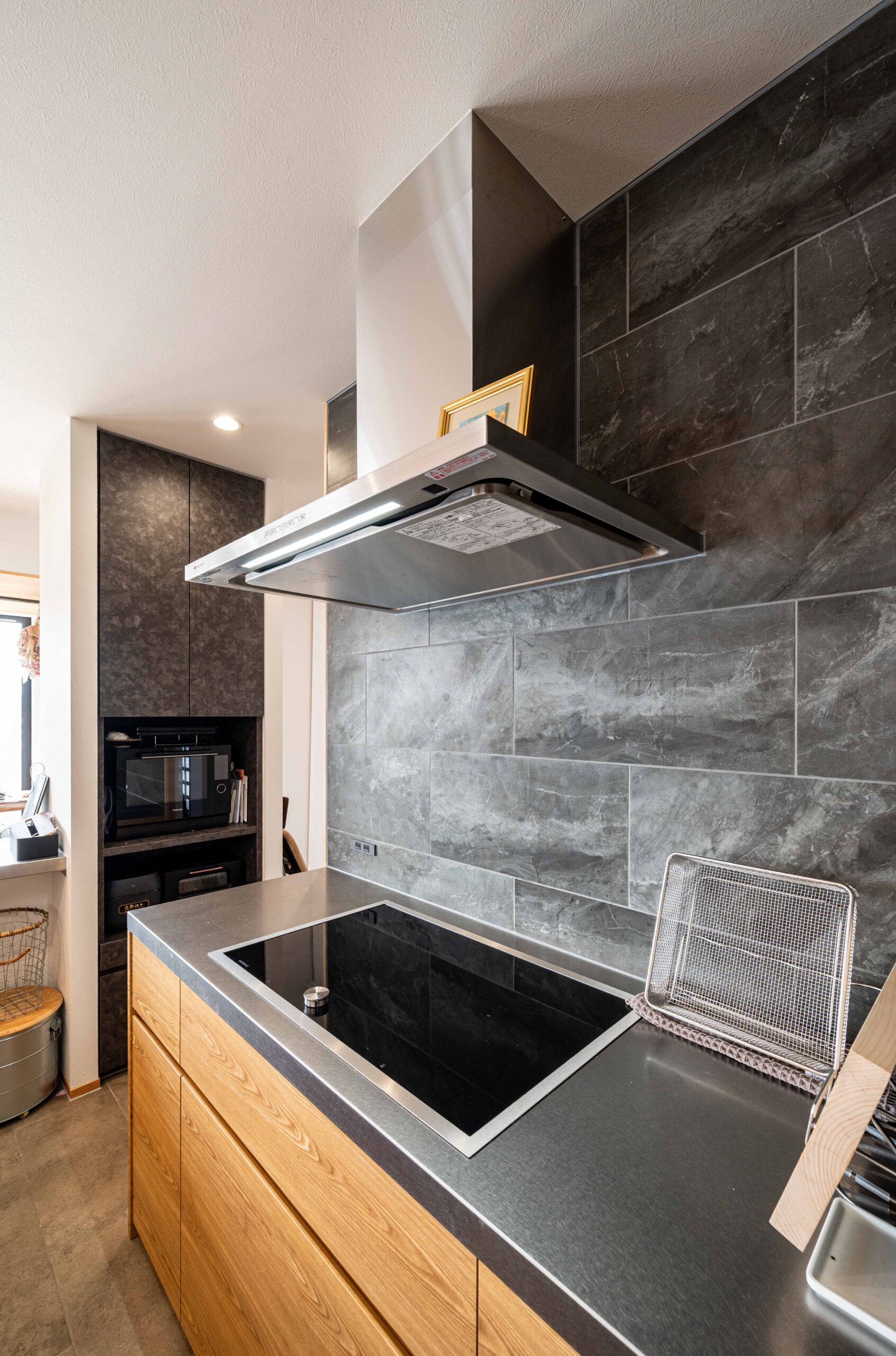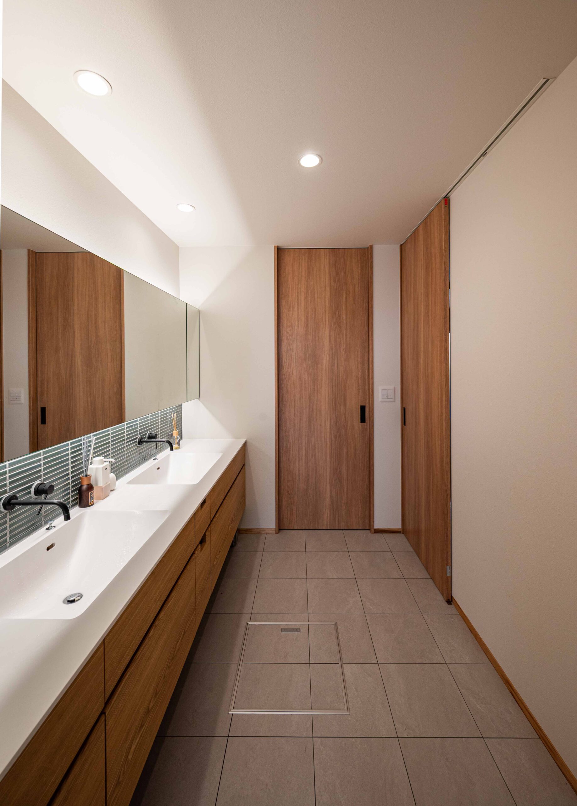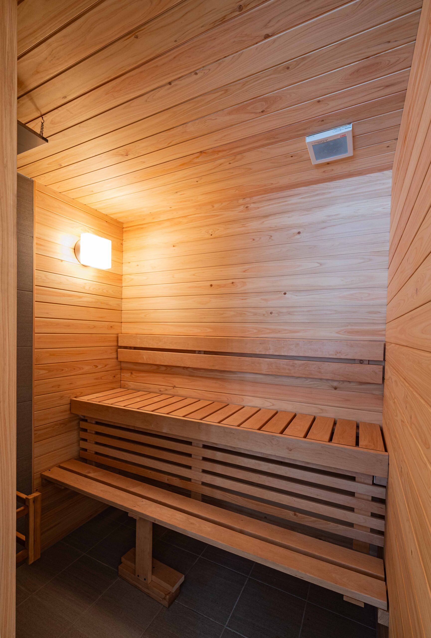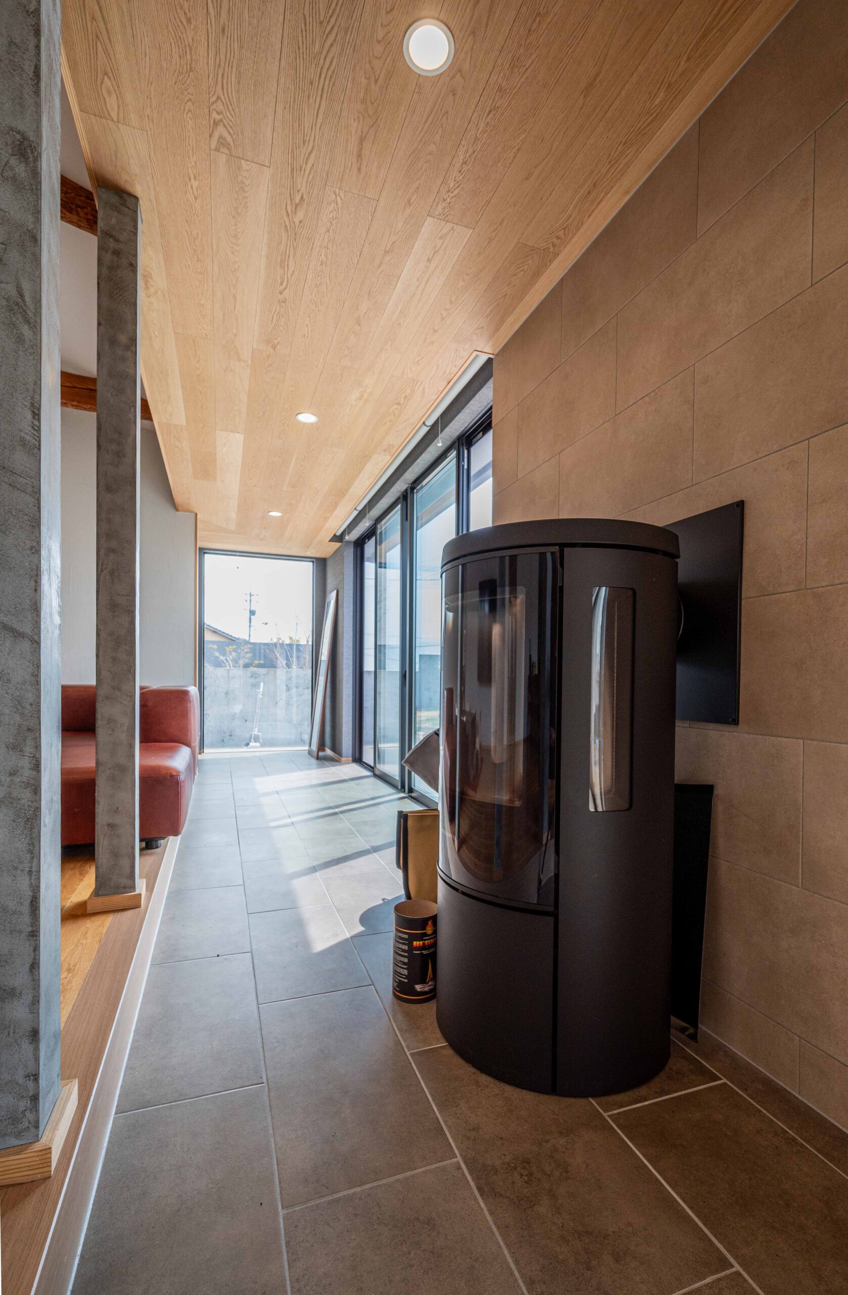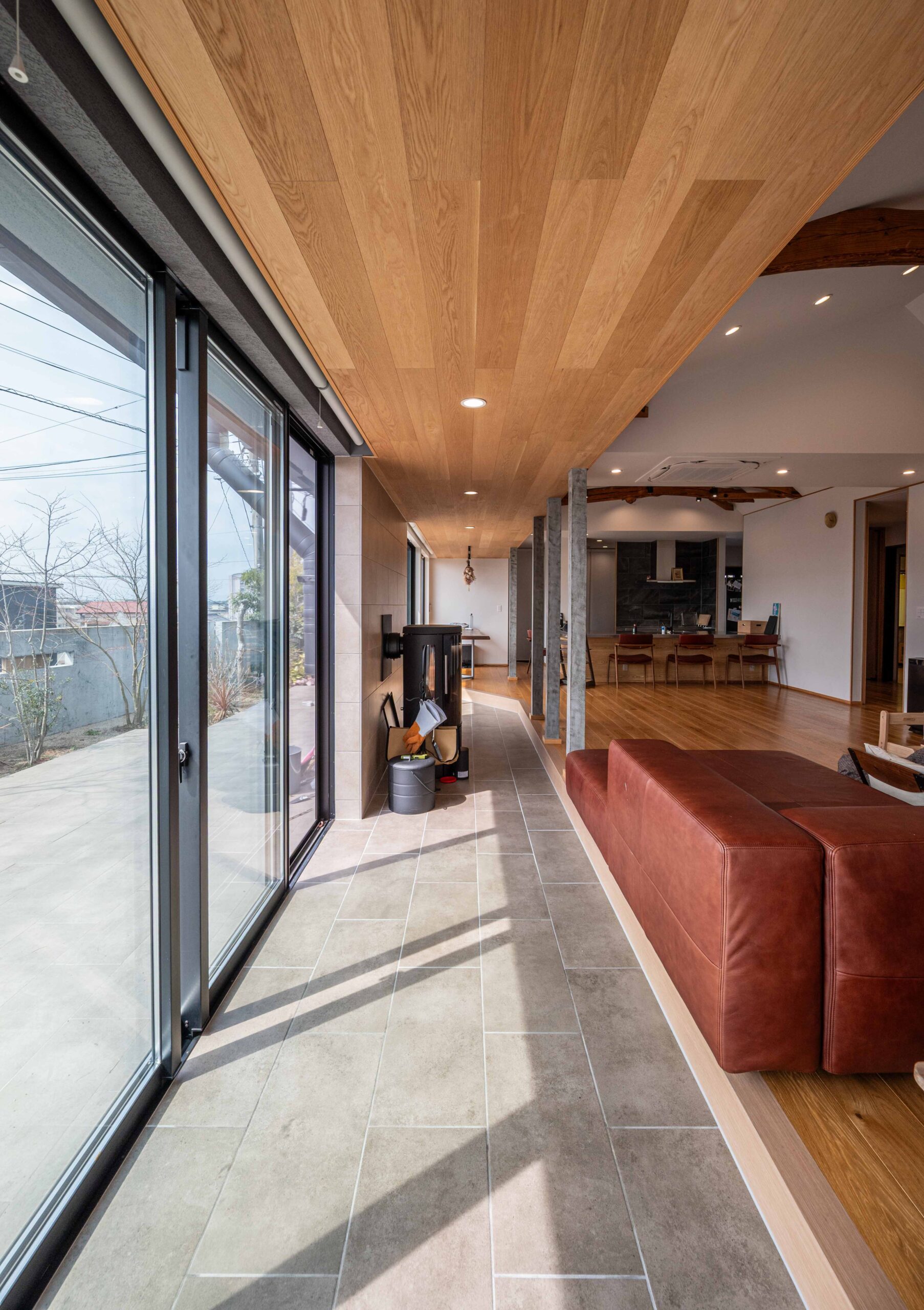 古民家から移築した古材の梁を活かし、歴史の温もりを感じさせる空間を創り出しました。一方で、現代的なシンプルさと機能性も兼ね備え、古材の魅力を最大限に引き立てています。薪ストーブやプライベートサウナといった特別な空間は、日々の暮らしに豊かさと安らぎをプラス。自然素材の心地よさと、住まう人の個性を大切にした住まいです。